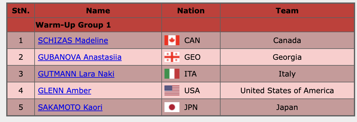 На разминку вышли три пары из второй группы — Сара Конти и Никколо Мачии из Италии, бывшие россияне Анастасия Метелкина и Лука Берулава, которые выступают за сборную Грузии, а также японская пара Рику Миура и Рюити Кихара.