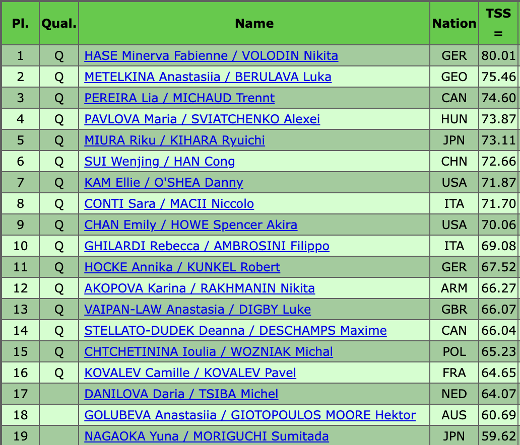 Особенно приятно, что на промежуточном первом месте оказался бывший российский фигурист Никита Володин, выступающий в паре с Минервой Фабьенне Хазе. На промежуточном втором месте — тоже экс-россияне Анастасия Метелкина и Лука Берулава. Еще одна пара из бывших россиян — Мария Павлова и Алексей Святченко — оказались на четвертой позиции, всего в одном балле от канадцев, которые заняли третье место.