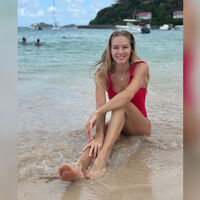 На снимке спортсменка позирует на пляже рядом с водой. На ней надет ярко-красный слитный купальник.