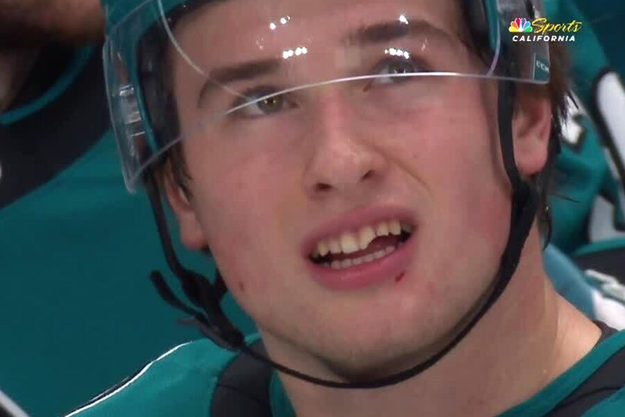 Российский нападающий «Виннипег Джетс» Никита Чибриков ударил клюшкой по лицу игрока «Сан-Хосе Шаркс» Маклина Селебрини во время матча регулярного чемпионата Национальной хоккейной лиги (НХЛ).