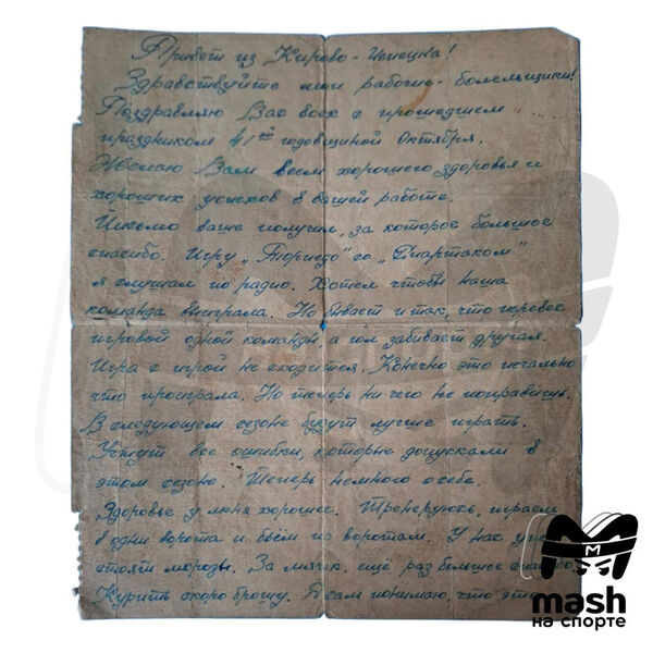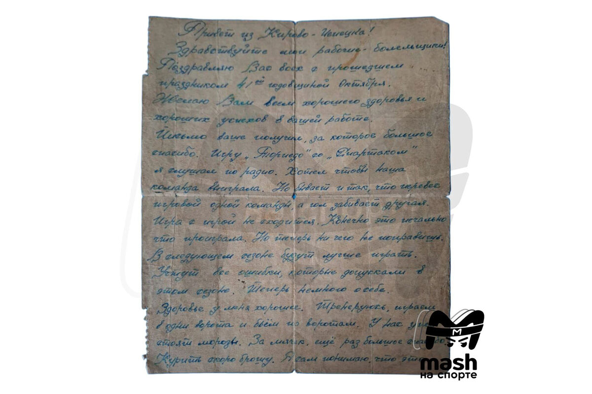 В письме прославленный футболист рассказал об условиях пребывания в заключении, быте и распорядке дня, вредных привычках и о том, что следил за ходом матча первенства страны между «Торпедо» и «Спартаком» по радиотрансляции.