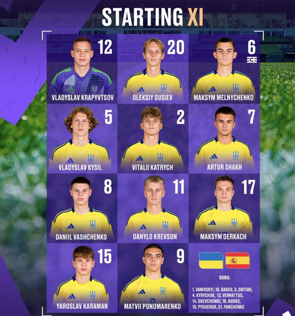 Стартовый состав сборной Украины: Владислав Крапивцов, Алексей Гусев, Максим Мельниченко, Владислав Кисиль, Виталий Катрич, Артур Шах, Даниил Ващенко, Даниил Кревсун, Максим Деркач, Ярослав Караман, Матвей Пономаренко.