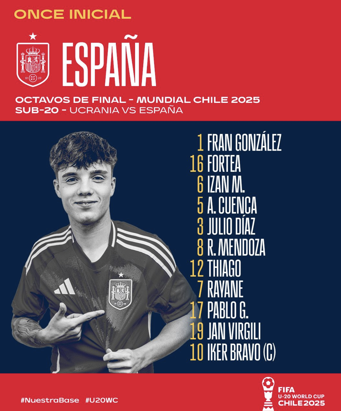 Стартовый состав сборной Испании: Фран Гонсалес, Фортеа, Исан, Куэнка, Хулио Диас, Мендоса, Тьяго Питарч, Райан, Пабло, Ян Вирджили, Икер Браво.