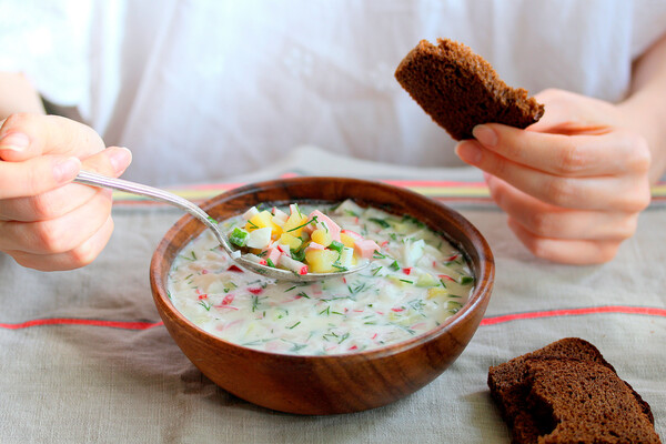 В советское время появилась уже привычная нам окрошка. Обычно в нее кладут вареную колбасу, отварной картофель, яйца, свежие или соленые огурцы, редис и свежую зелень. Заправляют кефиром или квасом — кто как любит.