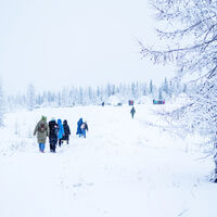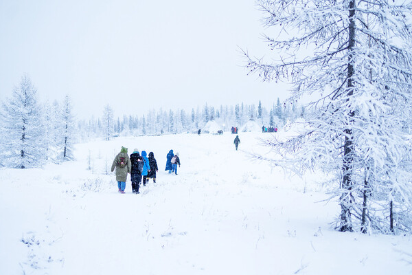Затем, погрузившись в автобус, мы двинулись на Этностойбище «Мув Тай» — обедать и ужинать национальными блюдами хантов, смотреть на заледеневшую Обь и в белоснежную даль тундры, кататься на оленях, строить чум, смеяться, примерять национальные костюмы и много общаться с местными. Дегустируя свежайшую строганину из пыжьяна, гости с интересом слушали из первых уст рассказ о сочетании традиционного образа жизни коренных народов с использованием благ цивилизации — и том, какая у этого цена. Оказалось, что, помимо других удобств, незаменимыми в быту кочевников стали спутниковые навигаторы, с помощью которых они отслеживают свое местоположение, планируют маршруты и возвращаются в лагерь, а также обращаются за медицинской помощью. С другой стороны, используя новые технологии, коренные народы впадают от них в зависимость — и теряют необходимые для выживания в тундре навыки.