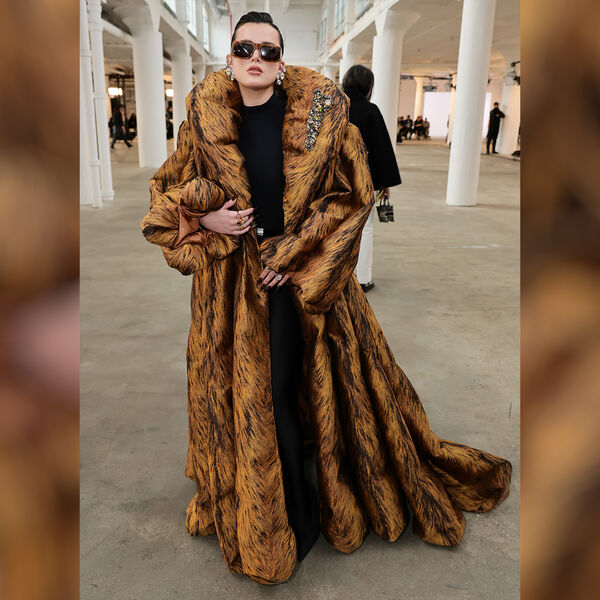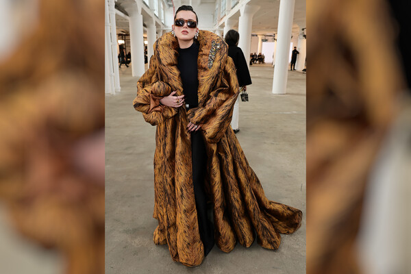 Перед камерой она позировала в объемной шубе и облегающем черном комбинезоне без нижнего белья. Образ дополнили золотые украшения и солнцезащитные очки. Волосы ей уложили в пучок и сделали вечерний макияж.