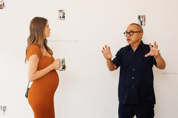 Фотографии были сделаны на выставке художника Кена Лама в галерее Studio 105. Дарья Жукова позировала в оранжевом облегающем платье, которое подчеркивало ее округлившийся живот. Волосы она распустила и сделали легкие локоны.