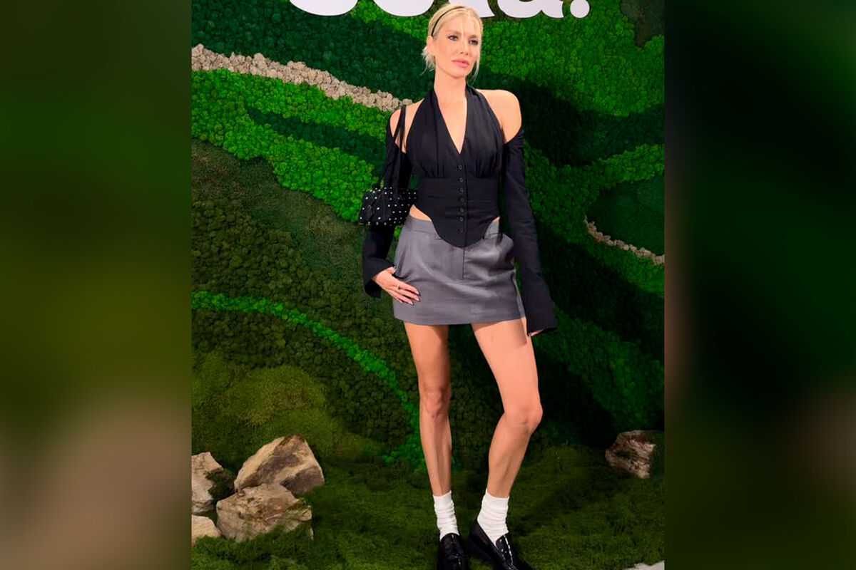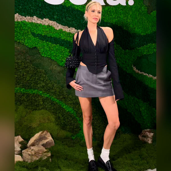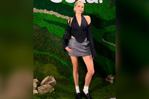 Модель Лена Перминова пришла на мероприятие в серой мини-юбке, черном корсете и кардигане. Образ завершила сумка с заклепками, белые носки и лоферы. Волосы Перминова собрала в низкий хвост и выпустила передние пряди. Ей также сделали макияж с угольно-черными стрелками.