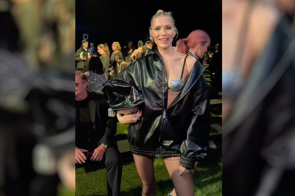 Модель Лена Перминова позировала в кожаной мини-юбке и бомбере. Образ дополнил серебряный лифчик в форме кошек Hello Kitty. Ей также сделали укладку с высоким пучком и вечерний макияж.