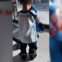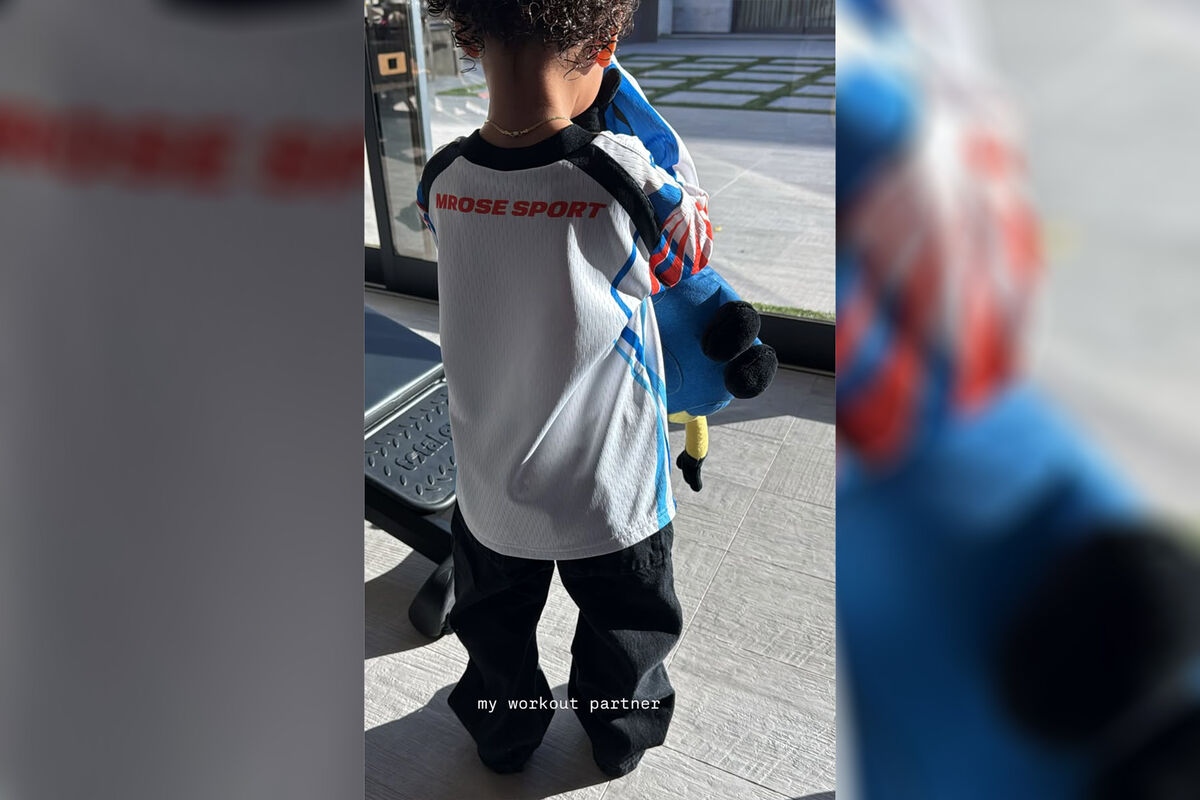 Кайли Дженнер показала, как мальчик в спортивной футболке с номером и черных брюках смотрел на внутренний двор через панорамное окно. В руках Эйр держал игрушку.