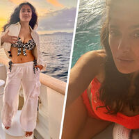 На одном из кадров 58-летняя Сальма Хайек позировала в бело-черном бикини, которое дополнила светлой курткой и широкими брюками. Актриса стояла с распущенными волосами и без косметики. На другом снимке артистка предстала в ярко-оранжевом купальнике.