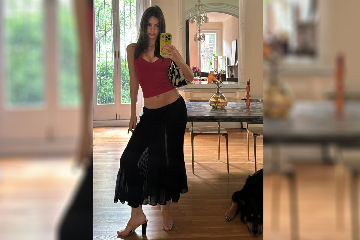 33-летняя Эмили Ратаковски стояла перед зеркалом в красном облегающем топе с глубоким декольте, черной абсолютно прозрачной юбке и горчичный кожаных босоножках на каблуках. Модель дополнила наряд золотым ожерельем, сумкой с анималистичным принтом и кольцом. Манекенщица распустила волосы и сделала макияж в естественном стиле.