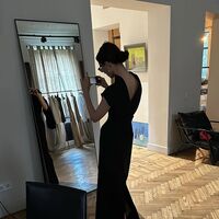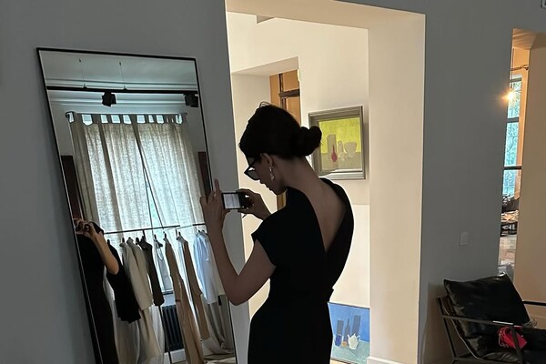 Диана Пожарская позировала в черном платье с голой спиной. Волосы она распустила и сделала легкий макияж. Съемку она устроила в бутике дизайнера перед зеркалом.