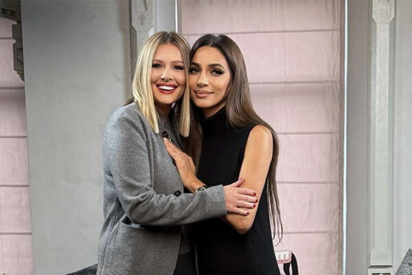 Мария Кожевникова позировала в серых облегающих брюках и жакете в тон. Волосы ей выпрямили и сделали макияж с красной помадой. В кадре она обнимала певицу Зару.