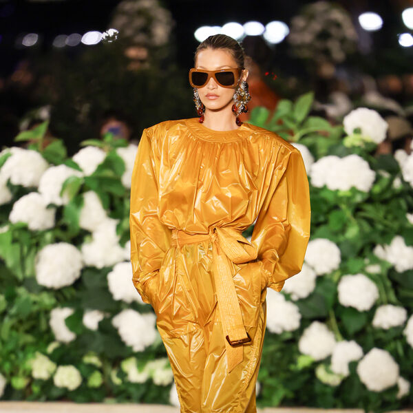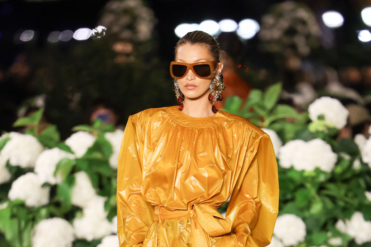 28-летняя Белла Хадид появилась на подиуме в желтом комбинезоне, коричневых колготках и солнцезащитных очках. Волосы ей уложили в низкий пучок и сделали акцентный макияж.