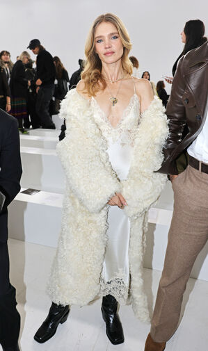 Наталья Водянова посетила показ бренда Ermanno Scervino, который прошел в Милане. Супермодель появилась на публике в белом платье-комбинации с глубоким декольте, длинной шубе и черных сапогах. Манекенщица дополнила образ золотыми ожерельями. Знаменитости уложили волосы в локоны и сделали макияж с черными стрелками.
