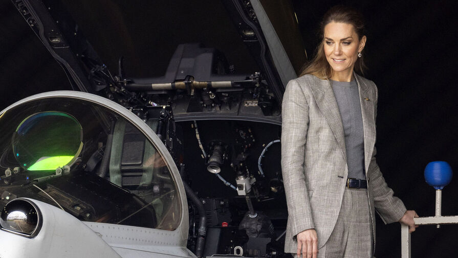 Принцесса Кейт Миддлтон в сером костюме посетила базу Королевских ВВС Великобритании. Об этом сообщает People.
