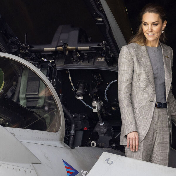 43-летняя принцесса Уэльская появилась в приталенном сером костюме в клетку от бренда Bella Freud. Образ дополнили серый топ Alexander McQueen, туфли на высокой шпильке, серьги с сапфирами и бриллиантами из коллекции принцессы Дианы и золотая брошь в виде крыла ВВС. Кейт Миддлтон заглянула в новый учебный центр, где ей предложили испытать авиасимулятор полетов.