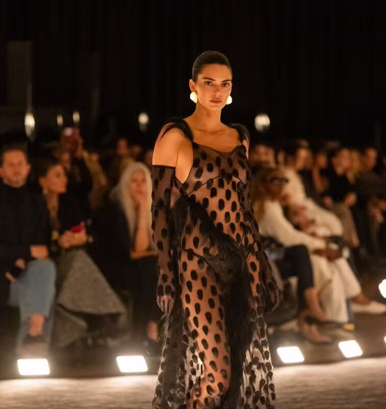 Кендалл Дженнер вышла на подиум в «голом» черном макси-платье с меховым декором и без бюстгальтера. Образ дополнили длинные перчатки, массивные золотые серьги, браслет на ноге и туфли на шпильке.