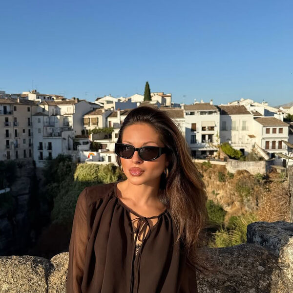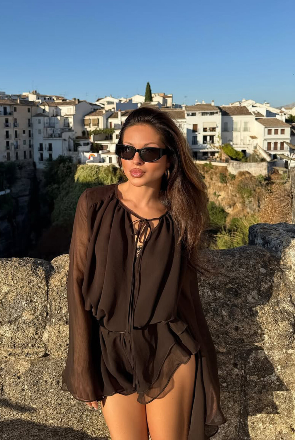Нюша предстала перед камерой в шоколадном шифоновом комбинезоне с длинными рукавами и короткими шортами. 35-летняя певица также надела массивные золотые серьги и черные солнцезащитные очки. Поп-исполнительница была запечатлена с распущенными волосами и макияжем с розовым блеском для губ.