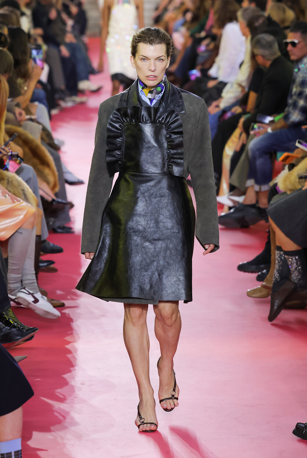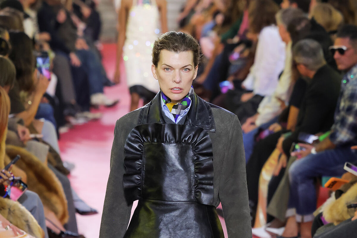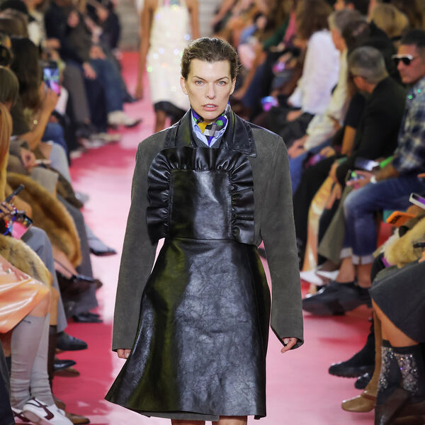 Милла Йовович приняла участие в показе бренда Miu Miu, который прошел 6 октября в рамках Недели моды в Париже. Актриса вышла на подиум в темно-серой замшевой куртке, голубой рубашке с платком, черном кожаном фартуке и босоножках на каблуках. Знаменитости уложили волосы и сделали макияж в естественном стиле.
