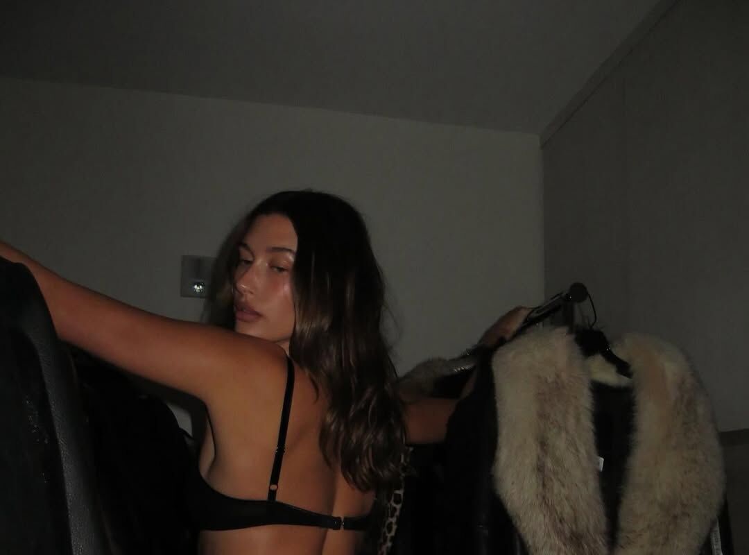 31-летняя Хейли Бибер предстала перед камерой в черном комплекте белья. Модель была запечатлена с уложенными распущенными волосами и макияжем. Манекенщица стояла в гардеробной.