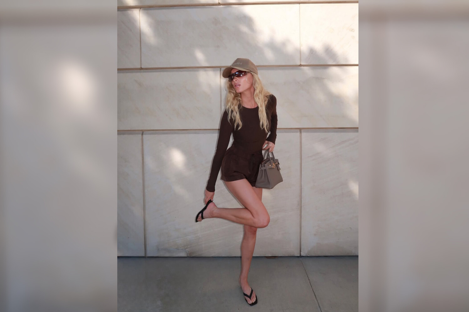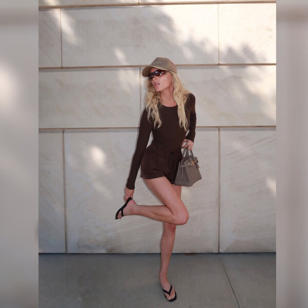 36-летняя Эльза Хоск предстала перед камерой в шоколадном комплекте, который состоял из лонгслива и коротких шортов. Модель добавила к образу солнцезащитные очки, кепку, черные вьетнамки и светло-серую сумку Hermes Birkin. «Ангел» Victoria's Secret уложила волосы в легкие локоны и сделала макияж в естественном стиле с блеском для губ.