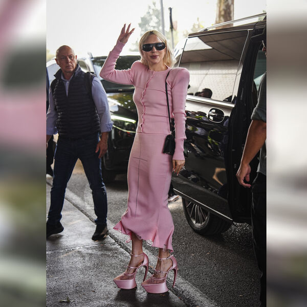 Папарацци засняли Леди Гагу 11 октября около аэропорта Милана. Певица была запечатлена в розовом облегающем кардигане с объемными плечами, юбке-миди и туфлях на экстремальных кривых каблуках с бантами. Поп-исполнительница добавила к образу солнцезащитные очки и сумку на плечо. Знаменитости уложили волосы и сделали макияж с темно-розовой помадой.