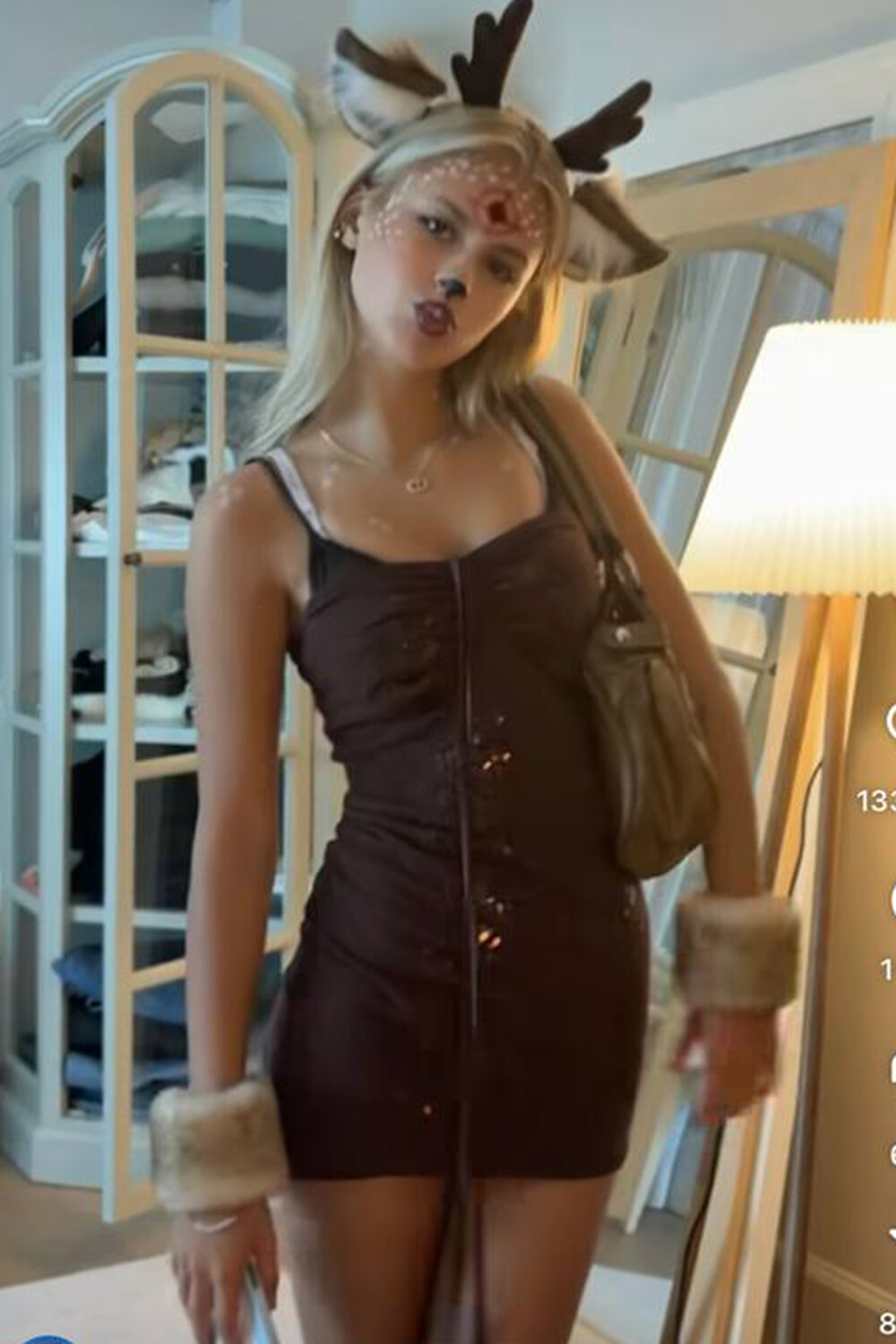 Анджелина сделала анималистический макияж и перевоплотилась в оленя с прицелом на лбу. Дочь Бони позировала в коричневом мини-платье и дополнила образ меховыми браслетами.
