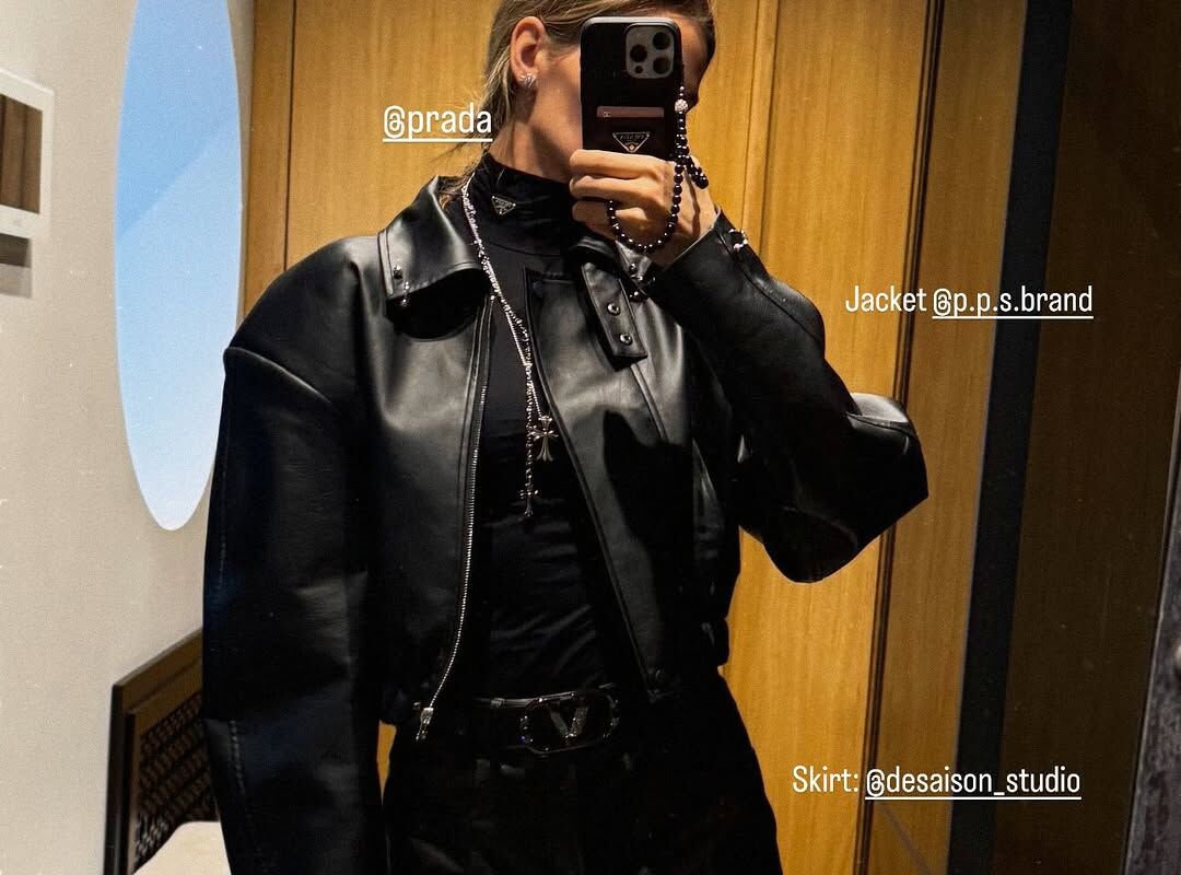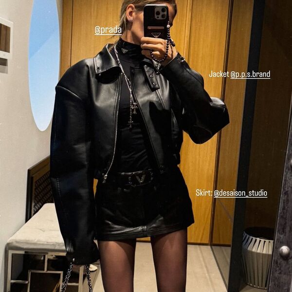 Алеся Кафельникова позировала в черной кожаной мини-юбке, бомбере и водолазе. Образ дополнила сумка Chanel, стоимость которой составляет 440 тысяч рублей.
