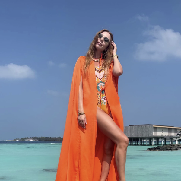 43-летняя Наталья Подольская позировала перед фотографом в оранжевом слитном купальнике с разноцветным узором, который сочетала с длинной накидкой в тон. Певица также надела массивные браслеты, колье и солнцезащитные очки. Поп-исполнительница распустила волосы и отказалась от макияжа. Знаменитость была запечатлена, стоя на камнях на Мальдивах.
