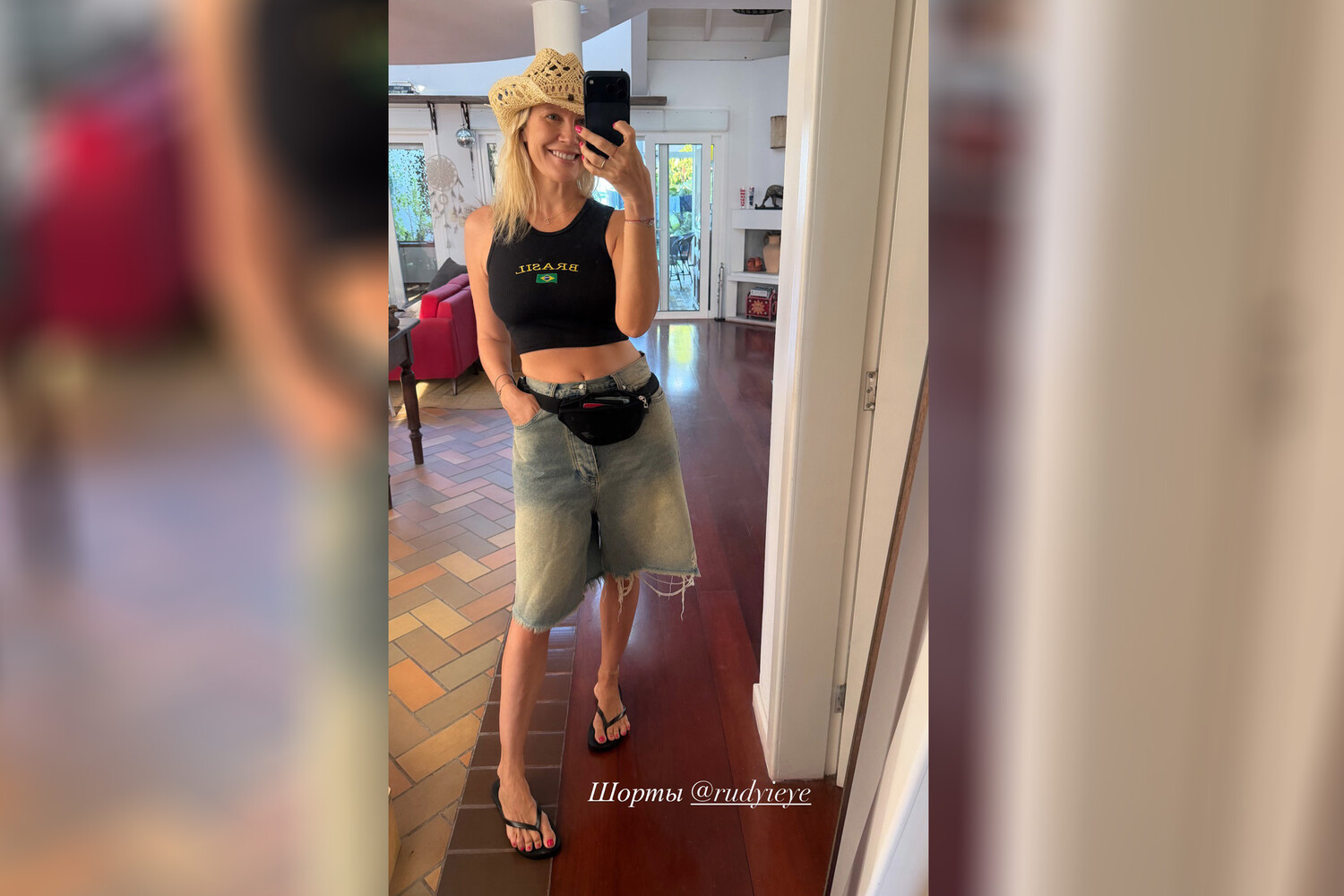 Елена Летучая позировала в рваной юбке, черном укороченном топе с принтом и шляпе. Образ дополнили шлепки и поясная сумка. Волосы она распустила и отказалась от макияжа. Телеведущая с мужем отправилась на концерт в Бразилии.
