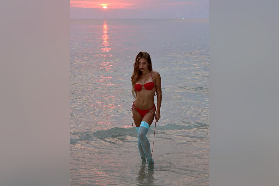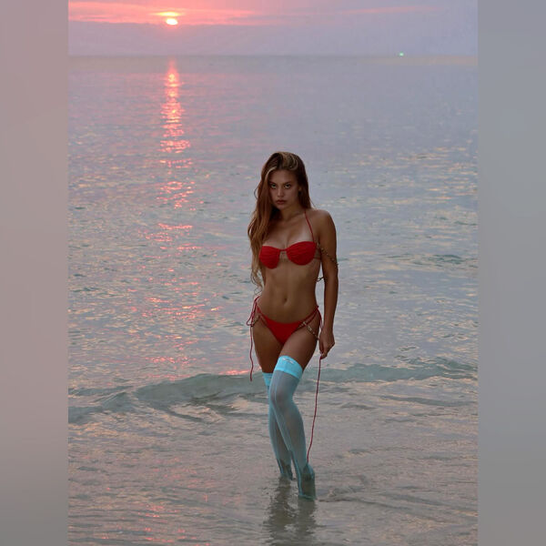 25-летняя Дилара Зинатуллина предстала перед камерой в красном бикини с золотыми цепочками, которое дополнила голубыми чулками. Блогерша была запечатлена с распущенными волосами и макияжем в естественном стиле. Знаменитость стояла в воде на фоне заката.