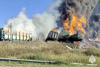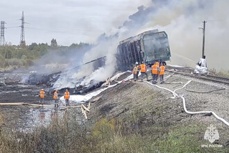 Поезд с бензином столкнулся с фурой под Смоленском. Вагоны в огне, водитель погиб